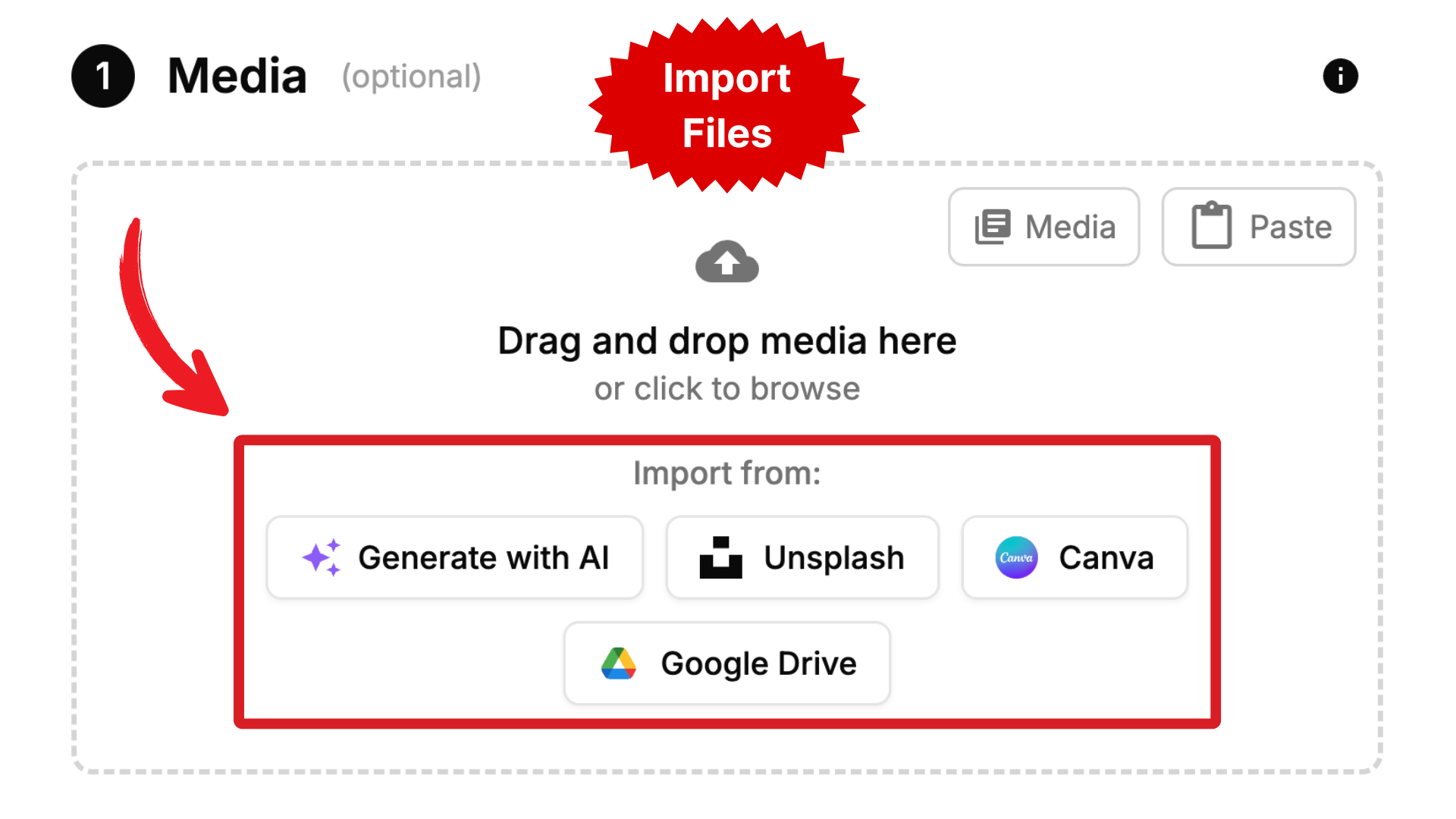 Generate images with AI or import files from Canva and Google Drive. No downloads. No re-uploads. Just pick, edit, and post.