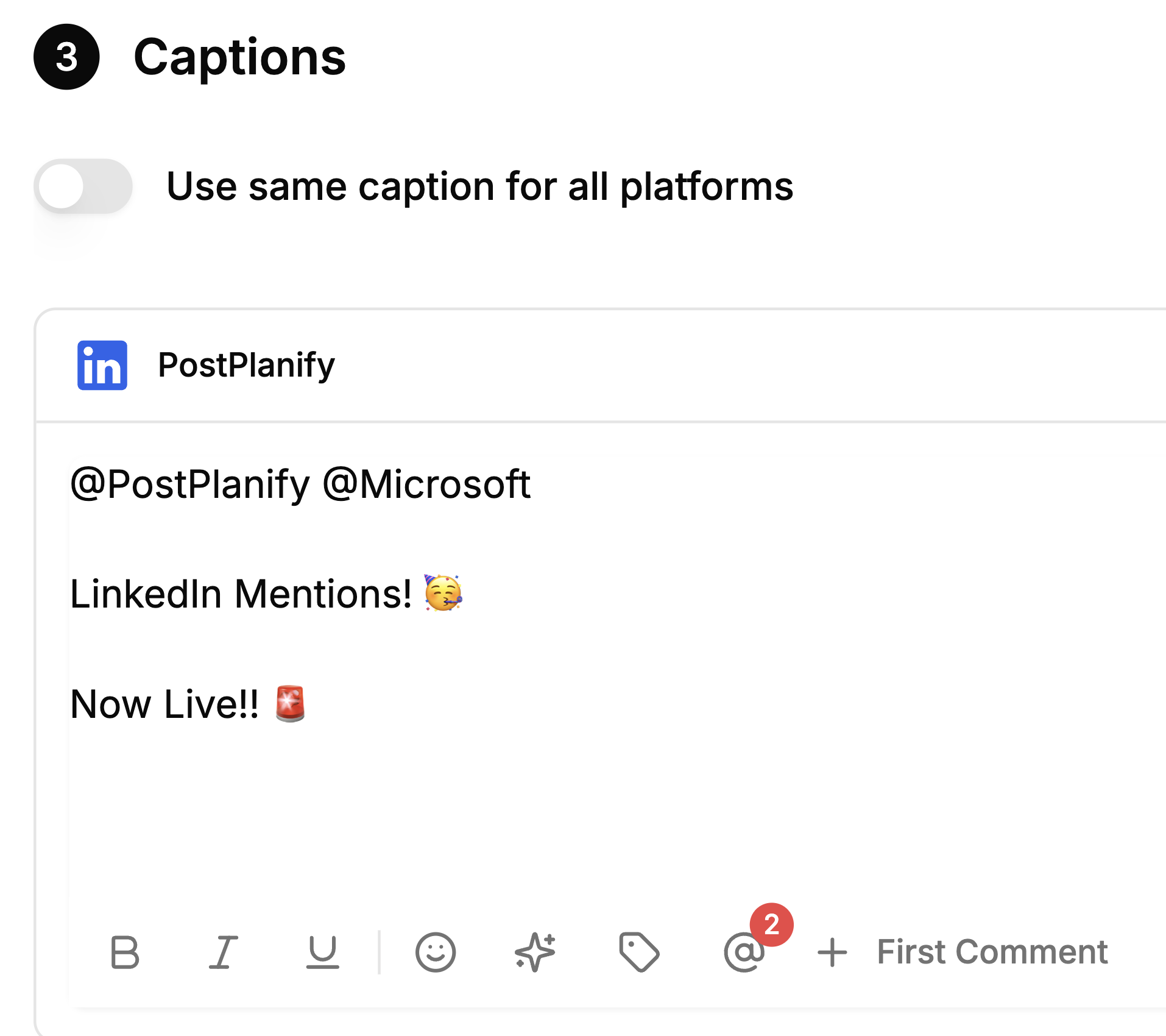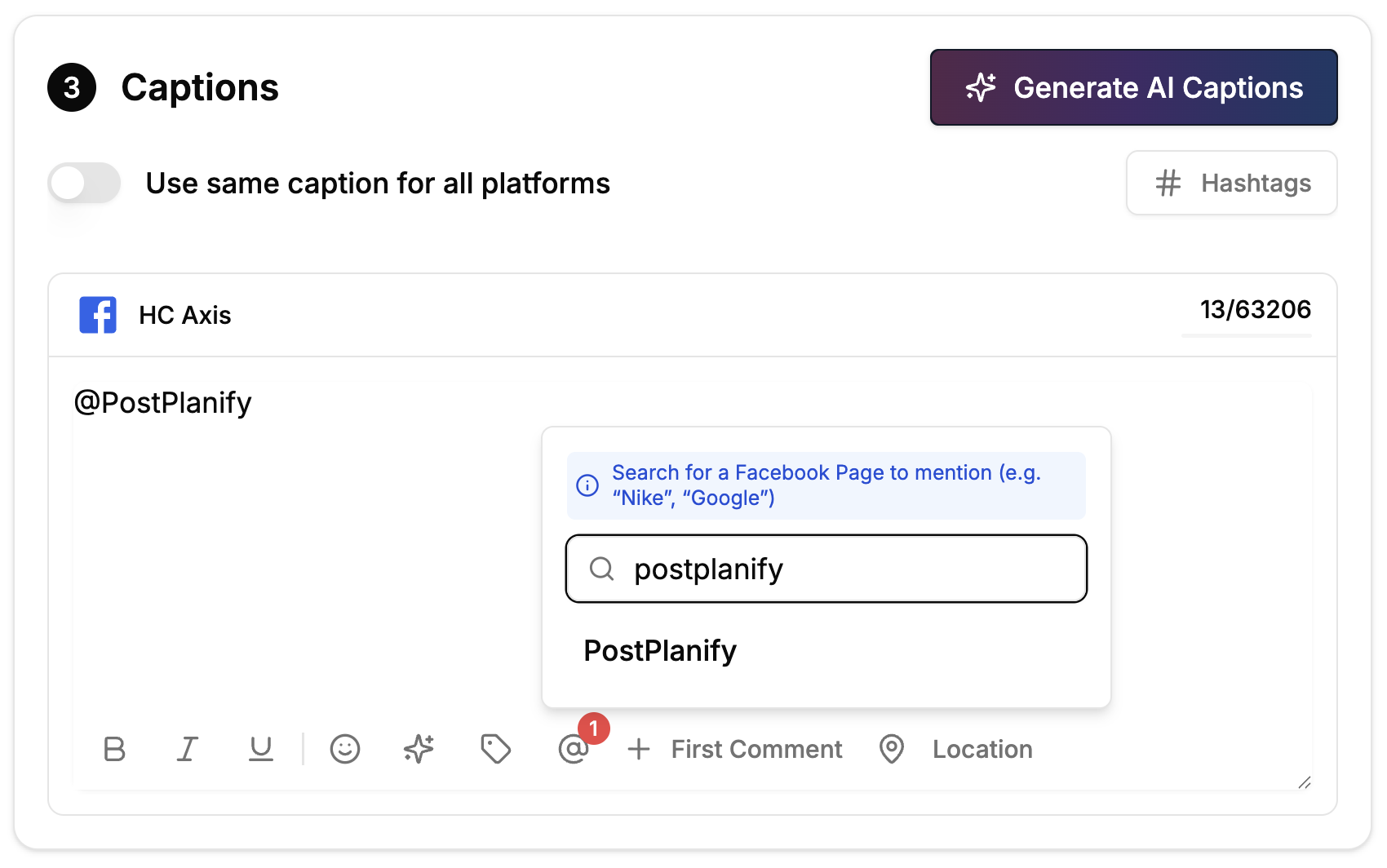 - Tagged pages appear as clickable mentions in your published posts, great for partnerships, shoutouts, and cross-promotion