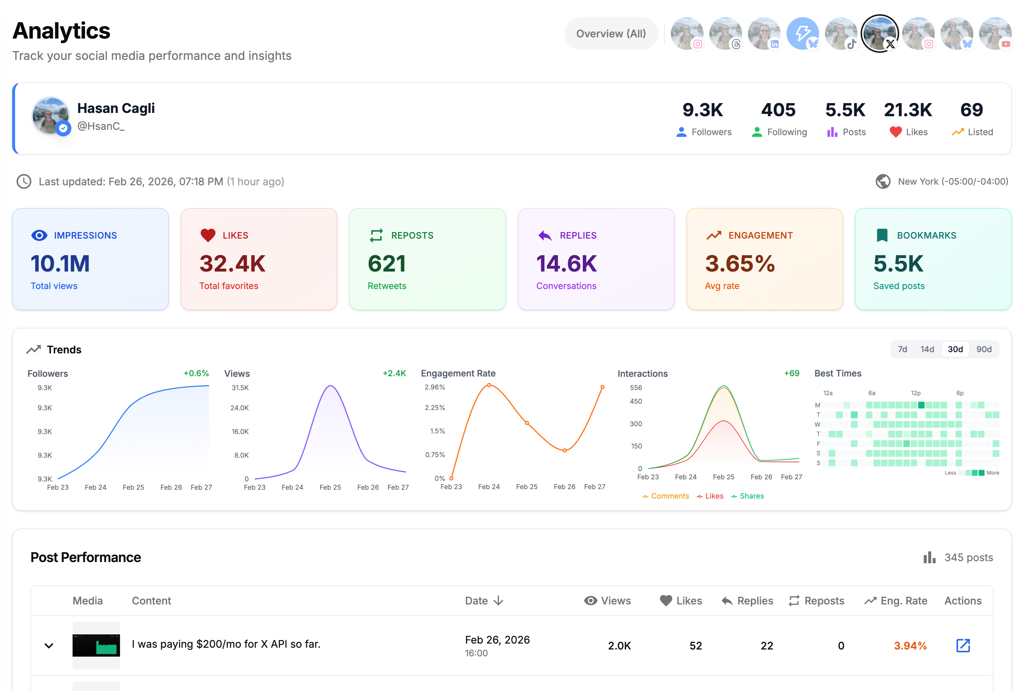 Schedule posts, track analytics, and manage your inbox across 10 platforms — from one dashboard.